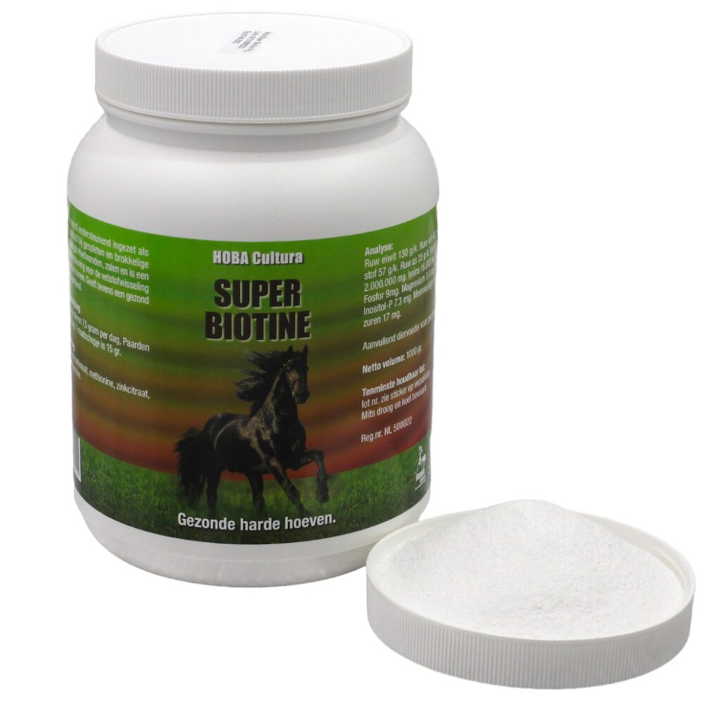 Super Biotine, wordt ondersteunend ingezet als specifieke grondstof bij gespleten en brokkelige hoeven, beschadigde hoefwanden, zolen en is een belangrijke ondersteuning voor de vetstofwisseling en de groei van de hoeven. Geeft tevens een gezond en glanzend haarkleed. Biotine, calcium carbonaat, methionine, zinkcitraat, lysine, maltodextrine.